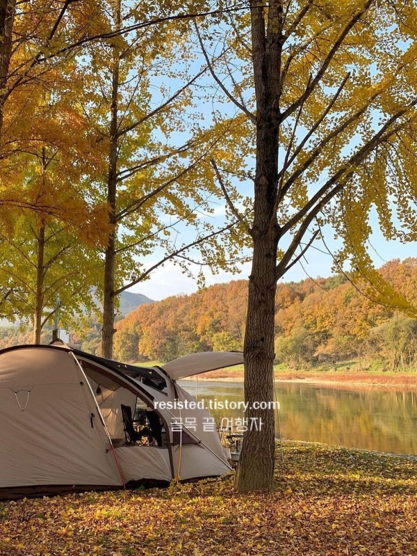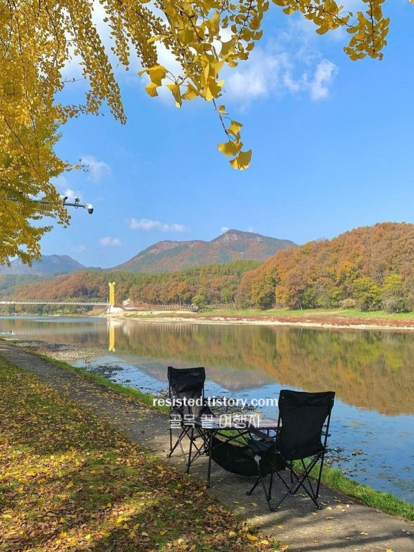 영동 송호국민관광지는 금강을 따라 조용히 펼쳐진 단풍 산책길이 참 아름다운 가을 충청도 가볼만한곳 베스트 10이에요. 입장료는 현재 무료, 주차장도 별도 요금 없이 이용할 수 있어 부담이 없답니다. 캠핑을 즐기시는 분들은 참고해 주세요. A~E구역은 15,000원, F구역은 20,000원 정도예요.