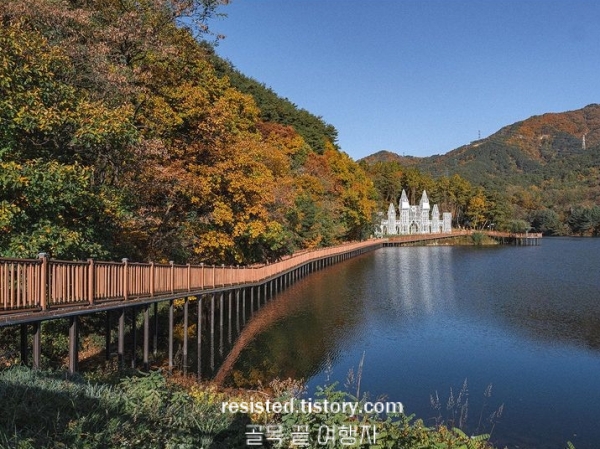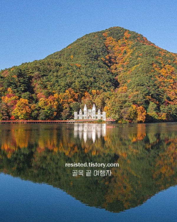 제천 비룡담 저수지는 충북 제천시 모산동에 자리한 조용하고 감성적인 힐링 스팟이에요. 숲속을 따라 나무 데크길이 부드럽게 이어지고, 잔잔한 저수지에는 유럽풍 하얀 성이 비쳐 마치 동화 속 장면을 걷는 듯한 느낌을 줘요. 10월 말부터 11월 초쯤 단풍이 절정이 되고, 해가 질 무렵 조명이 하나둘 켜질 때쯤이면 붉은 단풍과 반영이 어우러져 그야말로 그림이 따로 없죠. 수변 산책로는 1.1km부터 시작해 최대 2.8km까지 여유롭게 선택할 수 있어 가볍게 걷기 좋은 가을 충청도 가볼만한곳 베스트 10입니다.