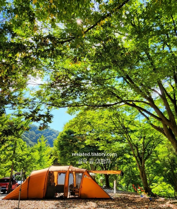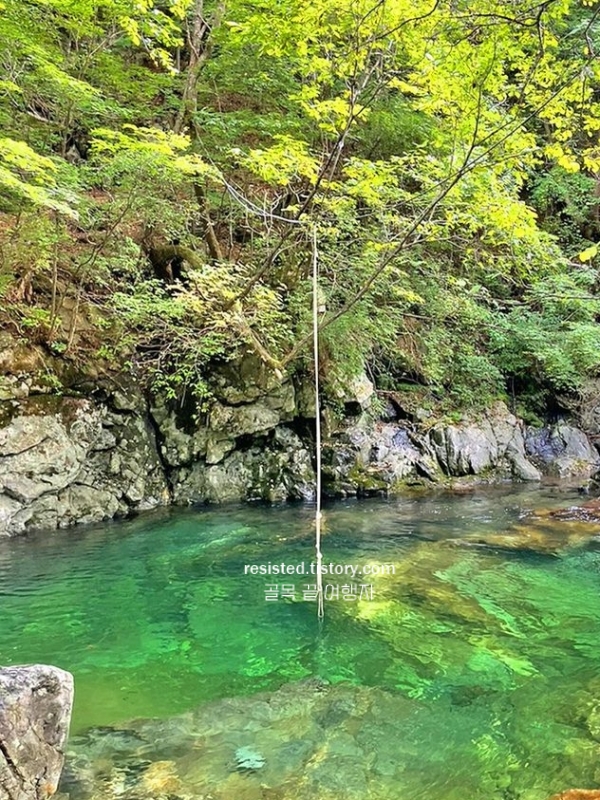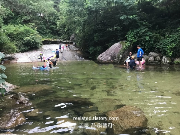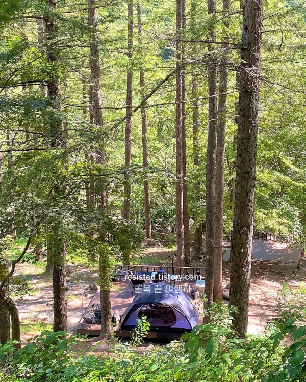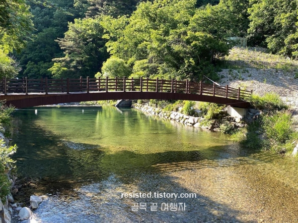 계곡 주변엔 기암절벽과 병풍처럼 둘러싼 노송들이 풍경을 감싸고, 물보라가 햇살에 반짝일 때면 ‘여름이 조용히 흐르는 풍경화’ 속에 들어온 기분이 들기도 합니다. 계곡을 따라 흐르는 탐방로는 약 2km가 조금 넘는 평탄한 숲길이었어요 . 야영족들도 보였는데, 무료 야영 가능 구역이라 자연 속 노지 캠핑까지 가능한 보석 같은 계곡이란 평가가 많은 이유기도 해요.
