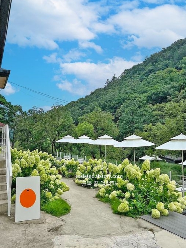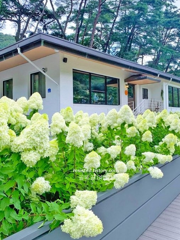 까망감 스테이의 유럽 수국은 테라스 곳곳에 하얗게, 퐁실퐁실 피어 있어요. 까망감 카페, 스테이 숙박 고객이 아니어도 다녀오기 좋은 유럽수국 명소로 숲속 리틀포레스트에서 자리한 이곳은, 방마다 따뜻하게 마련된 자연 속 치유의 공간이었어요. 아침엔 숲 향기와 함께 마당을 거닐다가, 오후엔 수국을 바라보며 차 한 잔 곁들일 수 있죠. 푸릇한 산과 수국의 조합이 수채화 같았습니다.