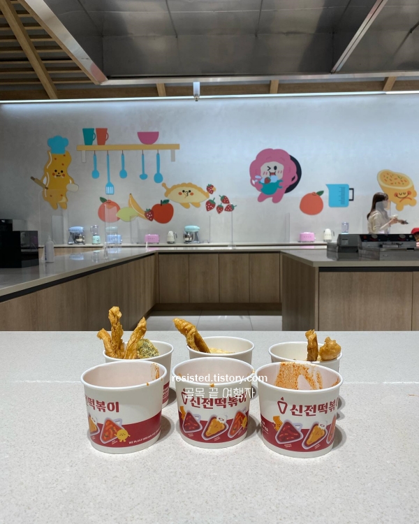 비 오는 날 들른 신전뮤지엄은 체험형 떡볶이 박물관이었다. 입장하자마자 스탬프 찍는 구역과 전시 공간이 이어지고, 이어서 떡볶이 만드는 체험이 기다리고 있었다. 아이들은 위생 가운을 입고 비커를 들며 실험실 놀이를 하듯 요리를 시작했고, 완성된 떡볶이는 직접 시식할 수 있었다. 요리 과정에서 만든 밀키트는 자동화 시스템으로 밀봉되어 기념품처럼 챙겨 나올 수 있다