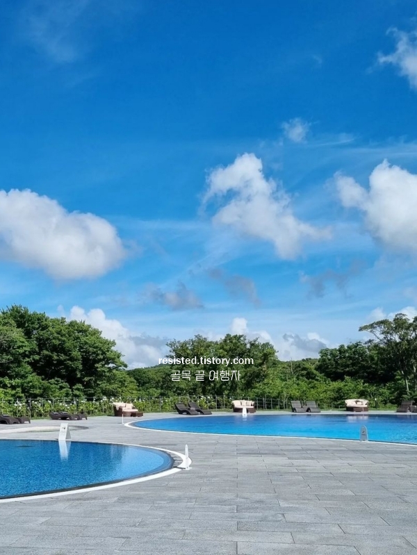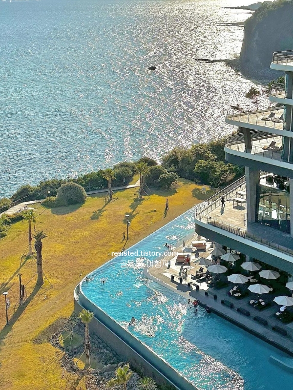 처음엔 그냥 “길다”는 말로 설명되던 수영장이었는데, 막상 눈앞에 펼쳐지니 느낌이 달랐어요. 물에 떠 있는 기분보다, 그 물 너머로 이어진 바다 때문에 순간 어디까지가 수영장이고 어디부터가 제주 바다인지 헷갈릴 정도였거든요. 호텔 수영장 중에서도 이런 오션뷰는 흔하지 않아요. 수영장 끝 쪽에 가서 바다를 마주보고 서 있으면, 물과 하늘 사이 어딘가에 떠 있는 느낌이 들어요. 사진은 그냥 셔터만 눌러도 인생샷이에요. 따로 포즈 안 잡아도 되는 그 정도.