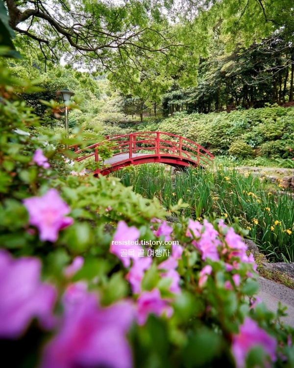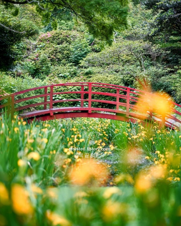 제주 도심에서도 가까운 한라수목원은, 5월 제주도 가볼만한곳 10곳 꼭 한 번 걸어볼 만한 공간이에요. 수목원 안쪽 ‘죽림원’은 대나무숲으로, 걸음을 옮길수록 서늘한 공기와 함께 바람 소리가 다르게 들려요. 대나무 특유의 곧은 선들이 만들어내는 풍경도 멋있지만, 그 길 끝에 있는 연못 쪽으로 향하면 전혀 다른 장면이 펼쳐져요. 노란붓꽃이 연못 가장자리에 수채화처럼 피어 있어서, 빨간 다리와 함께 프레임에 담으면 진짜 그림 같은 사진이 돼요.